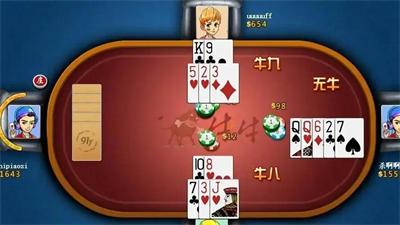2.玩家在组好牌后进行比牌时,如果双方都出现有牛的情况,那么此时就要比哪个牛大,通过剩余的两张牌再来进一步进行计算,将两张牌的点数相加如果少于10的话,被称为牛几,比如当前两张牌点数相加为8,就称之为牛8,如果说加起来的点数大于10的话,则取个位数的点数,比如加起来的点数为12,就以各位的2为准,称为牛二。